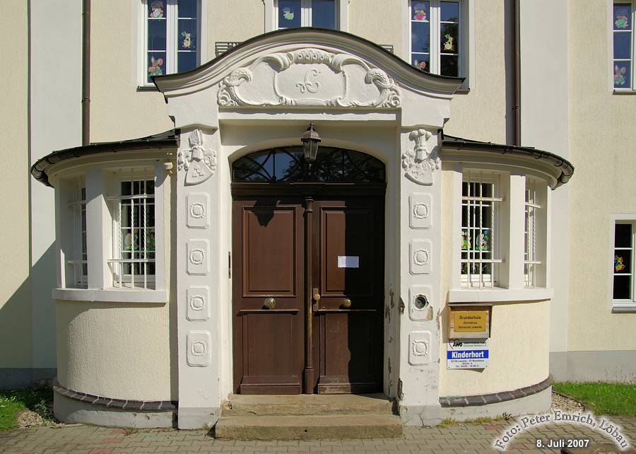 Portal des Herrenhauses mit Wappen und Monogramm des Curt von Carlowitz |