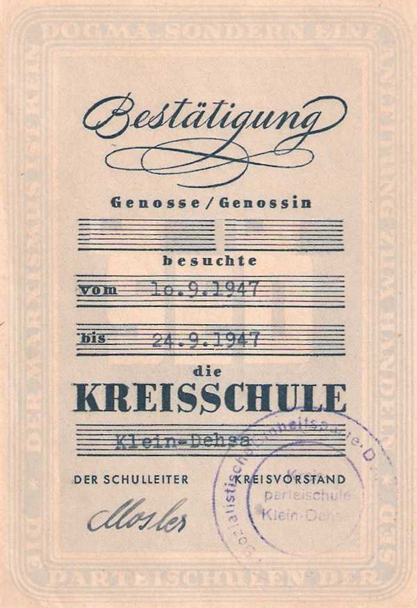 Urkunde der Kreisparteischule Klein-Dehsa aus dem Jahre 1947 -