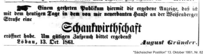 Schankwirthschaft von August Gründer eröffnet am 13. Oct. 1861 (Restauration Feldschlösschen) |